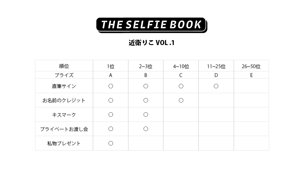 セルフィーブック本体に加え、落札の順位に応じて各種特典が付与されるほか、たとえ落札ができなくても、先着の50名の入札者には生写真が無料でプレゼントされるなど、参加者のみなさま全員が楽しめる特典もご用意しました。