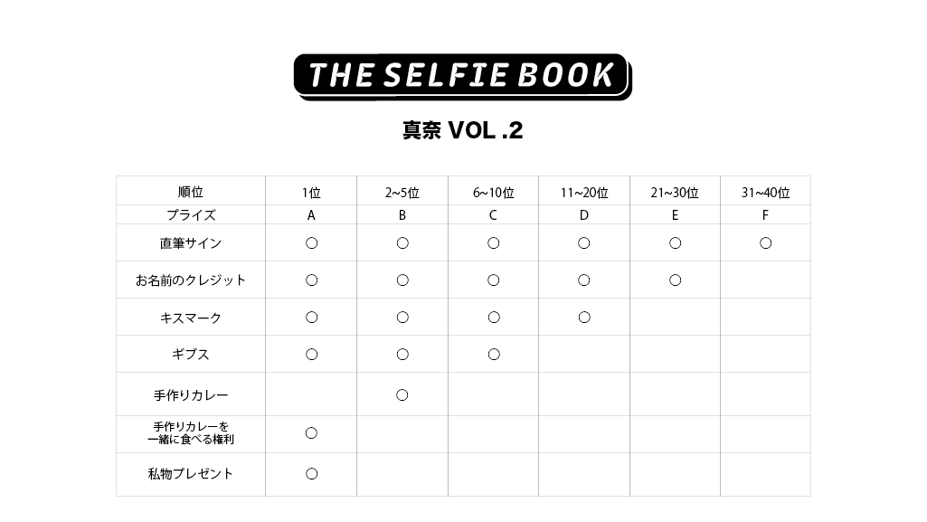 セルフィーブック本体に加え、落札の順位に応じて各種特典が付与されるほか、たとえ落札ができなくても、先着の50名の入札者には生写真が無料でプレゼントされるなど、参加者のみなさま全員が楽しめる特典もご用意しました。